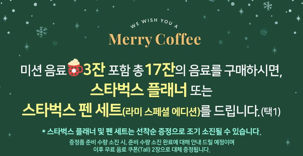 '스타벅스 2019 크리스마스 e-프리퀀시 이벤트'는 미션 음료 3잔을 포함하여 총 17잔의 음료를 구매하시면 스타벅스 플래너 또는 스타벅스 펜 세트(라미 스페셜 에디션) 중 하나를 선택하여 증정받으실 수 있습니다. 스타벅스 e-프리퀀시를 다 채우시면 받을 수 있는 플래너나 펜 세트는 선착순으로 증정되므로 조기 소진 될 수 있습니다.