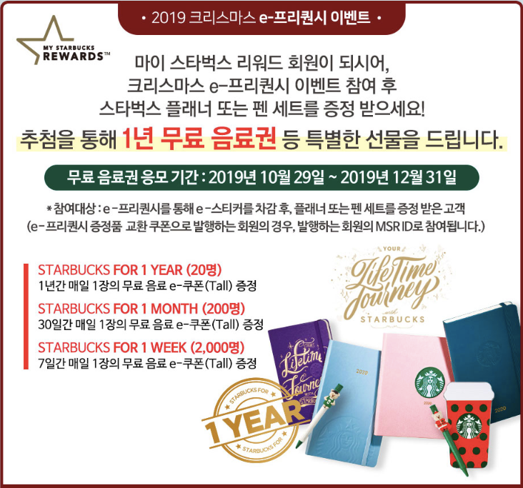 추가적으로 스타벅스 2019 크리스마스 e-프리퀀시 이벤트 기간 중 마이 스타벅스 리워드 회원에 가입한 후 스타벅스 플래너 또는 펜 세트를 증정 받은 고객을 대상으로 추첨을 통해 1년 무료 음료권을 증정하는 추가 이벤트도 진행합니다.