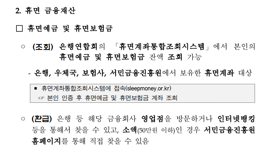 휴면예금 및 휴면보험금 잔액은 은행연합회의 '휴면계좌통합 조회시스템(슬립머니)'에서 조회할 수 있습니다.(은행, 우체국, 보험사, 서민금융진흥원에서 보유 중인 휴면금융재산 대상임. 단, 저축은행 및 상호금융 휴면예금은 저축은행중앙회 및 각 상호금융중앙회 홈페이지에서 조회 가능)