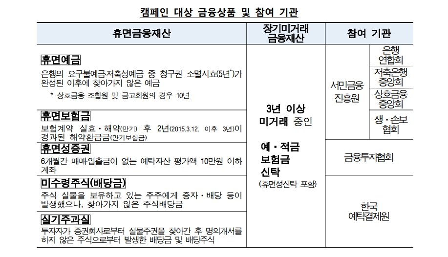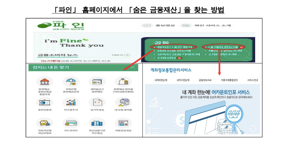 이번 숨은 금융자산 찾기 캠페인은 금감원 금융소비자 정보 포털 '파인'(http://www.fss.or.kr/fss/kr/main.html) 이나 금융결제원의 계좌통합관리 서비스 등을 통해서 전 금융권에 있는 본인 명의의 잠자고 있는 금융재산 및 휴면 금융재산을 찾고, 불필요한 계좌도 정리할 수 있습니다.