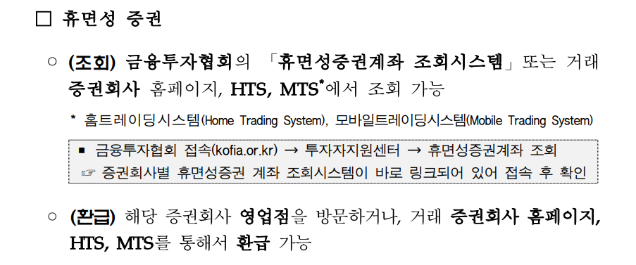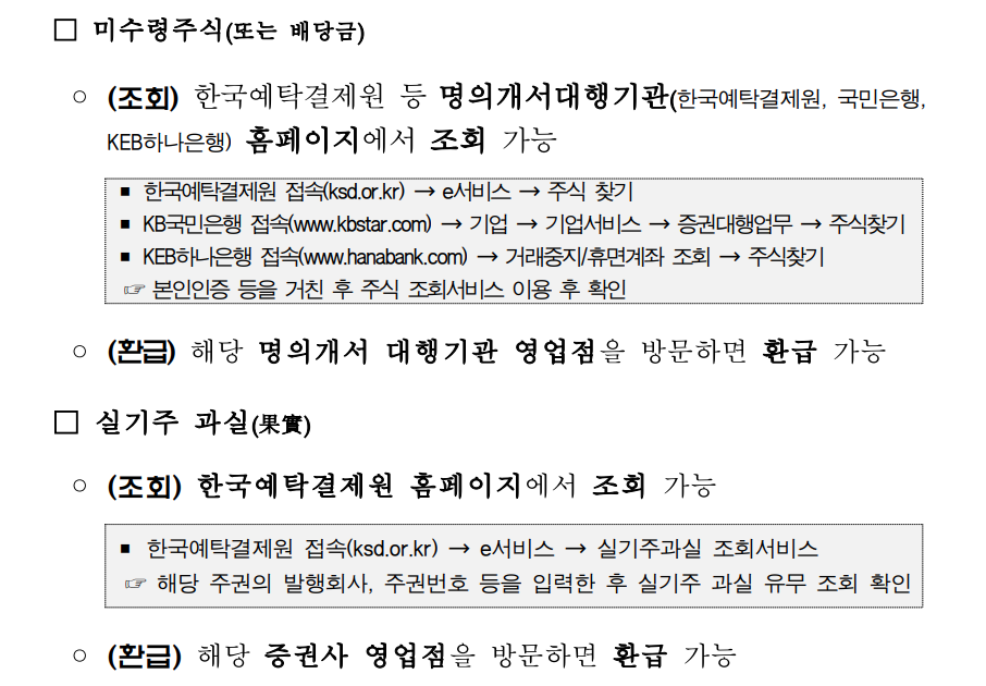 휴면성증권은 금융투자협회의 '휴면성증권계좌 조회시스템', 미수령주식(배당금)은 한국예탁결제원 등 명의개서 대행기관(한국예탁결제원, 국민은행, KEB하나은행) 홈페이지, 실기주과실(果實)은 한국예탁결제원 홈페이지에서 각각 조회 가능합니다.