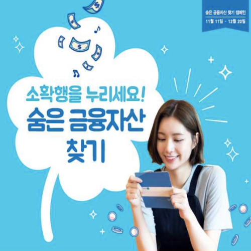 금융감독원과 전 금융회사가 공동으로 '숨은 금융자산 찾기' 캠페인을 11월 11일(월)부터 12월 20일(금)까지 6주간 실시한다고 밝혔습니다.