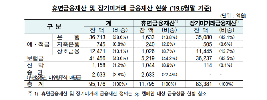 금융감독원과 금융권은 숨은 금융자산 찾아주기 캠페인 등을 지속 추진하여 지난 2015년 6월 이후 약 2.3조원을 환급한 바 있으나 아직도 금융 소비자들이 잊어버리고 장기간 찾아가지 않은 숨은 금융자산이 2019년 6월 말을 기준으로 9.5조(휴면 금융재산 1.2조원, 장기미거래 금융재산 8.3조원), 약 2억개 계좌에 이르고 있습니다.(상품별로는 예·적금 5.0조원, 보험금 4.1조원, 증권 0.3조원, 신탁 0.1조원)