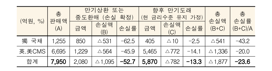 더욱이 문제가 된 2개 은행의 해외금리연계 DLF 총 판매 잔액은 7,950억원(8.7일 기준)을 대부분 9~10월중 손실(손실률 52.7%)을 보며 만기도래(991억원) 또는 중도환매(978억원)한 결과 11월 8일 기준 판매 잔액은 5,870억원으로 평균 손실률이 23.6%에 달했습니다.