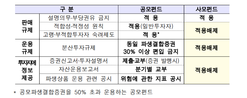 공모펀드는 펀드 설정 시 감독당국에 사전 신고를 해야 하고, 운용할 때도 포트폴리오에 특정 자산을 30% 이상 담을 수 없습니다. 그러나 사모펀드는 펀드 사전 신고나 자산 편중에 대한 규제를 받지 않아도 됩니다.