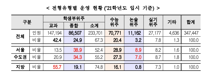 특히 입시 경쟁이 집중되고 있는 서울 소재 대학은 학종 및 논술위주 전형을 선호하여 수능 등 타 전형에 비해 운영 비중이 높은 상황이 계속 유지되어 온 반면 학생·학부모는 학생부 종합전형을 불공정한 전형으로 인식하여 학생 본인의 역량이나 노력보다는 고교 유형·부모 능력 등 외부 환경의 영향력이 크다는 인식이 확산되고, 평가결과에 대한 불신을 초래했습니다.