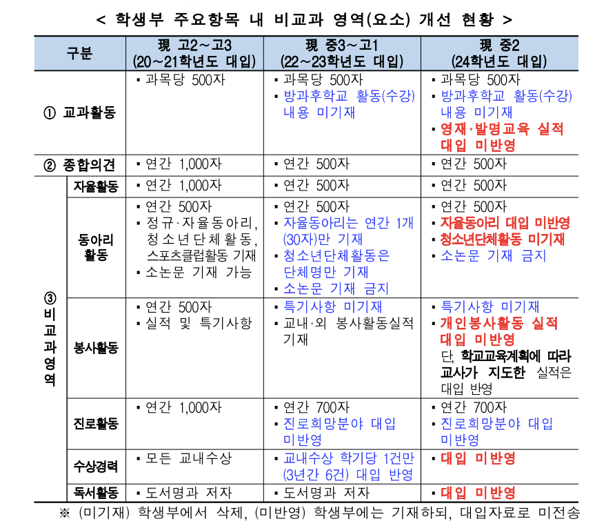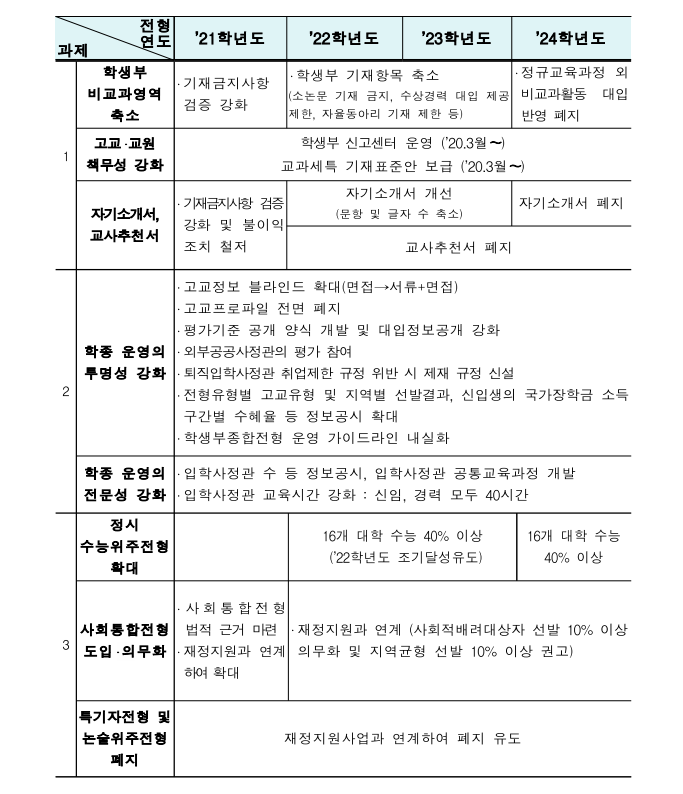 이에 따라 정규교육과정이 아닌 비교과 활동은 대입에서 폐지하고, 자기소개서 및 교사추천서는 단계적으로 폐지하되 기재 금지사항 검증 강화하고, 불이익 조치를 철저히 이행토록 했습니다.