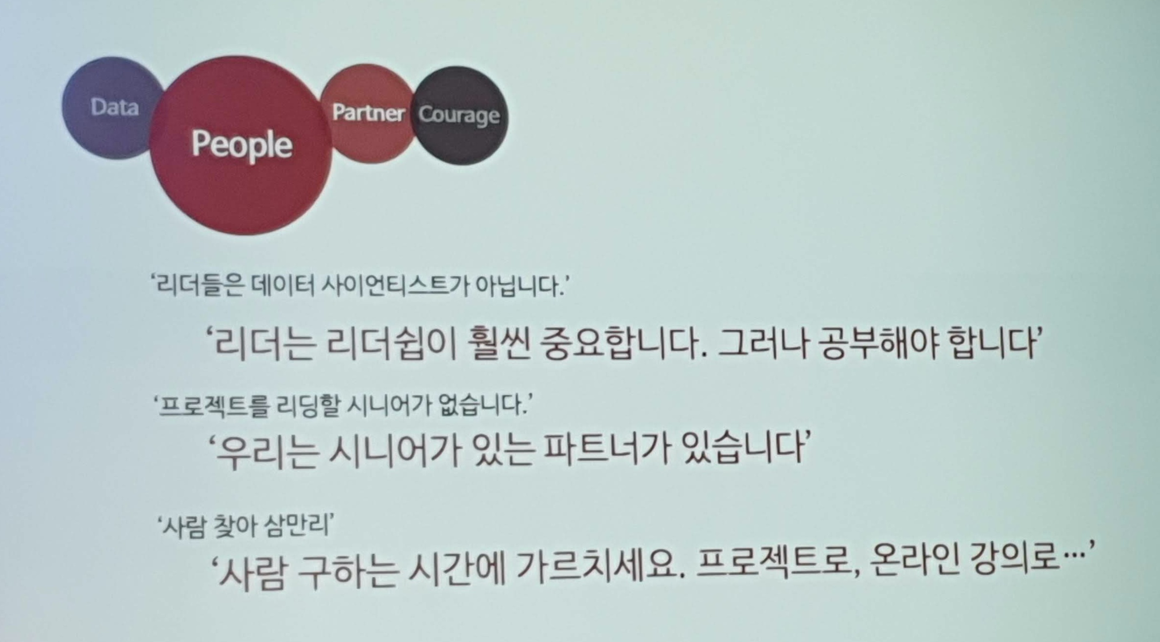 지난 AI SUMMIT 2019 SEOUL에서 발표자로 나온 한 그룹사 임원분께서 "리더들은 데이터사이언티스트가 아니다" 라고 말씀 하시며 전문지식보다는 리더쉽이 훨씬 중요하지만 리더들도 공부해야 한다고 강조하셨습니다.