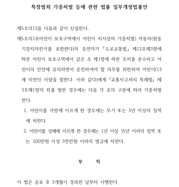 또, 민식이법 통과에 따라 특정범죄 가중처벌 등에 관한 법률 일부 개정으로 어린이보호구역내에서 발생한 교통사고로 인하여 사망사고가 발생할 경우 3년 이상 징역을 부과하고, 음주운전, 중앙선 침법 등 12대 중과실 교통사고로 인해 사망사고 발생 시 최대 무기징역까지 부과할 수 있게 되었습니다.