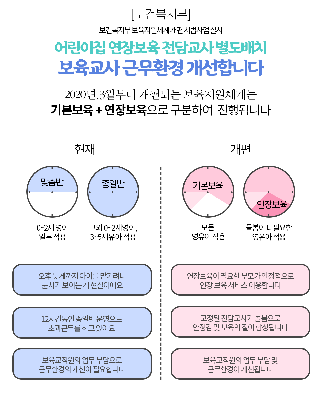 2020년 3월부터는 기존의 어린이집 종일 보육반 대신 오후 4시까지 운영하는 기본 보육과 저녁 7시 30분까지 운영하는 연장 보육으로 구분하여 연장 보육 전담교사 2.2만 명을 신규 배치합니다. 이에 따라 연장 보육료 지원이 신설되어 0세 및 장애아반의 경우 3천 원, 1~2세 반은 2000원, 3~5세 반은 1000원이 시간당 지원됩니다.