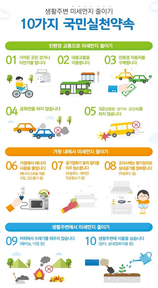 미세먼지 저감을 위해 최대 배출원인인 산업 사업장에 방지 시설 및 원격 자동측정기 설치 지원을 확대하고, 감시체계를 강화합니다. 이와 함께 소상공인과 영세 사업자를 대상으로 노후 경유차 및 건설기계에 대한 저공해 저감조치 지원을 확대하고, 조기 폐차 후 LPG 신차 구매 지원 물량을 1만 대까지 확대합니다. 또, 전국 566개 지하역사에는 미세먼지 저감설비를 확충하고, 서울 20개 역사에는 IoT, AI기반의 스마트 공기질 관리시스템을 시범 도입할 계획입니다.