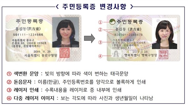 2020년 1월 1일부터는 내구성과 보안요소가 강화된 주민등록증이 발급됩니다. 내구성 강화를 위해 폴리카보네이트 재질로 변경되며 글자가 쉽게 지워지지 않도록 레이저로 인쇄하여 보안도 강화됩니다. 특히, 빛의 방향에 따라 주민등록증에 있는 태극문양의 색이 바뀌며 보는 각도에 따라 노출 여부가 결정되는 다중 레이지 이미지가 적용됩니다