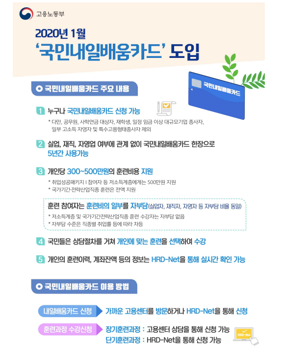 기존의 실업자와 재직자를 구분해서 발급되던 내일배움카드가 2020년부터는 '국민내일배움카드'로 실업자와 재직자 구분 없이 통합운영되어 한 장의 카드로 발급됩니다. 또, 유효기간이 기존 1년~3년에서 5년으로 연장되어 5년마다 재발급받으면 되고, 지원비용도 200만~300만 원에서 300만~500만 원으로 인상됩니다. 국민내일배움카드는 가까운 고용센터를 방문하거나 HRD-Net을 통해 발급받으실 수 있습니다.