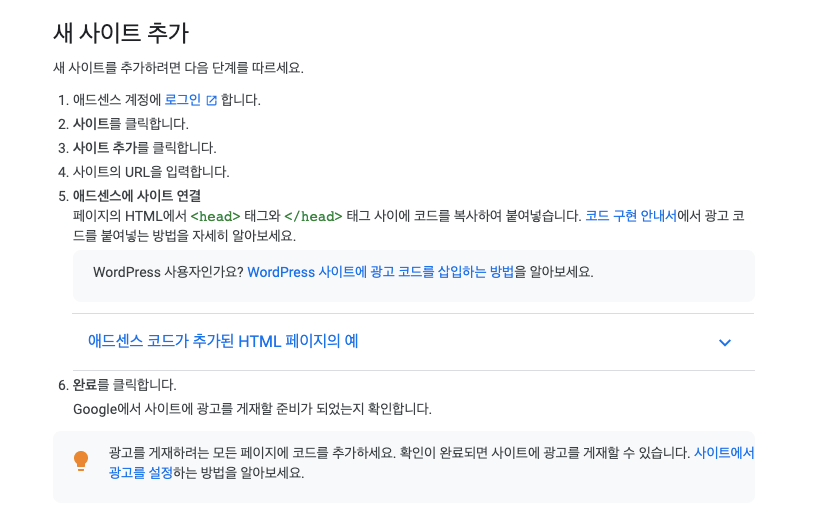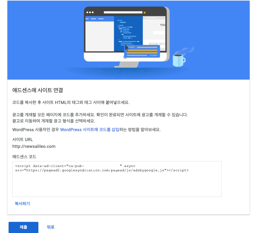 아래 구글에서 안내해주는 것과 같이 구글 애드센스에 로그인한 후 사이트 추가 - 사이트 URL 입력 - 코드 복사 후 티스토리 블로그 스킨편집에서 HTML 수정 - 제출 순으로 진행하면 됩니다.