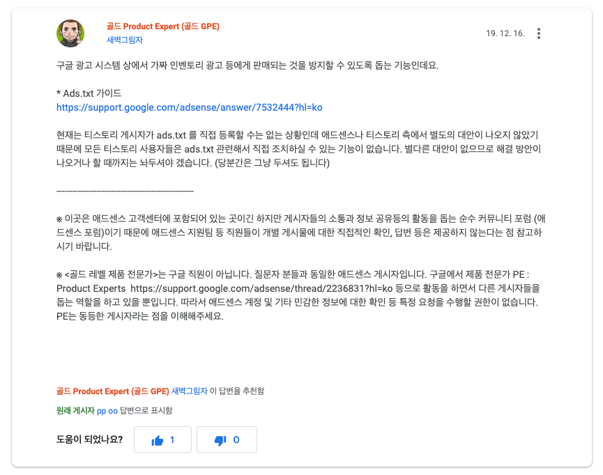 여기저기 구글링을 해보니 Ads.txt는 구글 광고 시스템 상에서 가짜 인벤토리 광고 등에게 판매되는 것을 방지할 수 있도록 돕는 기능으로 다행히도 해당 이슈에 대해서는 구글과 티스토리 모두 인지를 하고 있는 상태이나 별다른 대안이 없기 때문에 모든 티스토리 사용자들은 ads.txt 관련해서 직접 조치할 수 있는 기능이 없으므로 해결방법이 나올 때까지 놔두셔도 무방하다고 합니다.