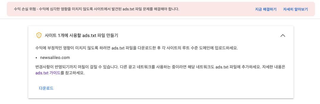 한 가지 우려되는 사항은 2차 도메인을 등록할 경우 아래와 같이 수익에 심각한 영향을 미칠 수 있다는 경고 메시지가 나타납니다. 수익 손실 위험이 있으니 Ads.txt 파일을 다운로드한 후 두 번째 티스토리 블로그 사이트의 루트 수준 도메인에 Ads.txt 파일을 업로드하라고 하는데 티스토리 정책상 파일을 루트에 업로드를 할 수 있는 방법이 없다는 것입니다.