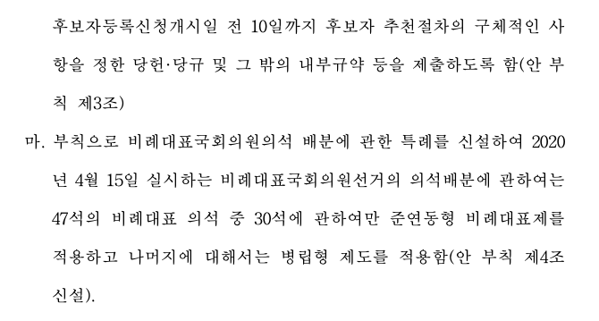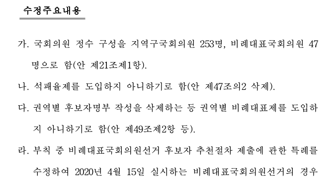 이번 공직선거법 개정안에는 4+1 협의체의 합의에 따라 논란이 되었던 석패율제도는 도입하지 않기로 했으며 비례대표 의석을 받을 수 있는 기준을 정한 봉쇄조항(최소 정당 득표율)도 현행인 3%로 유지하기로 했습니다.