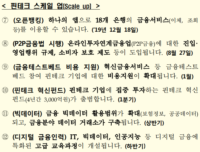 핀테크 산업 육성을 위해 금융 테스트베드에 참여하는 기업을 위해 테스트 비용 지원을 확대하고, 핀테크 기업에 집중적으로 투자하는 핀테크 혁신펀드가 4년간 3000억 원 규모로 조성됩니다. 또, 금융 빅데이터 활용범위가 보험정보 및 공공데이터로 확대되고, 금융분야 데이터 거래소가 구축되며 IT·빅데이터·인공지능 등 디지털 금융에 특화된 고급이론 및 심화실습 과정을 개설·운영됩니다.