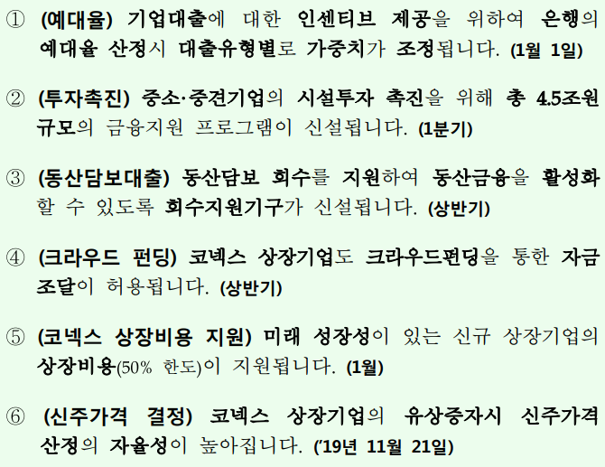 또, 중소·중견기업의 신·증설 투자 지원을 위해 4조5000억원 규모의 금융지원 프로그램도 신설되며 자산관리공사가 동산 담보 회수지원기구를 설치해 은행권의 부실 동산 담보 회수를 지원합니다.