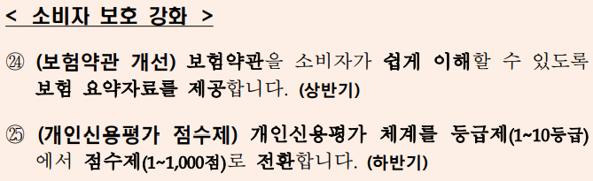 소비자 보호 강화를 위해 내년 상반기 중에 보험약관을 소비자가 쉽게 이해할 수 있도록 보험 요약자료를 제공하는 '보험약관 개선'도 시행되며 개인신용평가 체계는 내년 하반기 중 등급제(1~10등급)에서 점수제(1~1000점)로 전환됩니다.