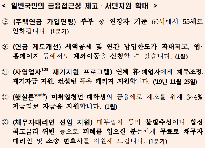 일반국민의 금융접근성 제고 및 서민지원 확대를 위한 제도도 시행됩니다. 먼저 자기 주택에 살면서 노후소득을 보장받는 주택연금 가입 가능 연령이 현행 60세 이상(부부 중 연장자 기준)에서 55세 이상으로 낮아집니다. 한국주택금융공사법 시행령 개정을 통해 내년 1분기 중 시행될 예정이며 연금계좌 세액공제 대상 납입 한도는 최대 600만원(퇴직연금 합산 시 900만원)으로 현행 400만원보다 200만원 늘어나게 됩니다.