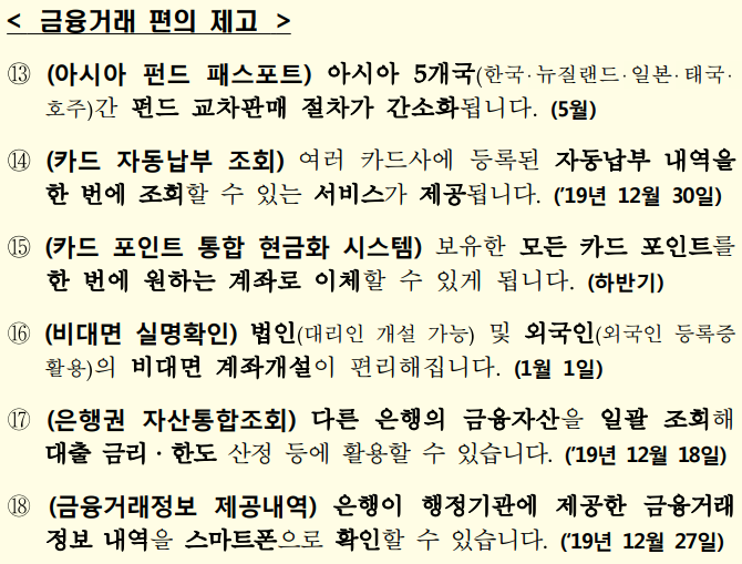 금융거래 편의 제고를 위해 한국·뉴질랜드·일본·태국·호주 등 아시아 5개국간 펀드 교차판매 절차를 간소화한 ‘아시아 펀드 패스포트’ 제도가 내년 5월부터 시행됩니다. 여러 카드사에 등록된 자동납부 내역을 한번에 조회할 수 있는 서비스가 제공되며 보유한 카드 포인트를 한 번에 원하는 계좌로 이체할 수 있도록 카드 포인트 통합 현금화 시스템이 구축됩니다.