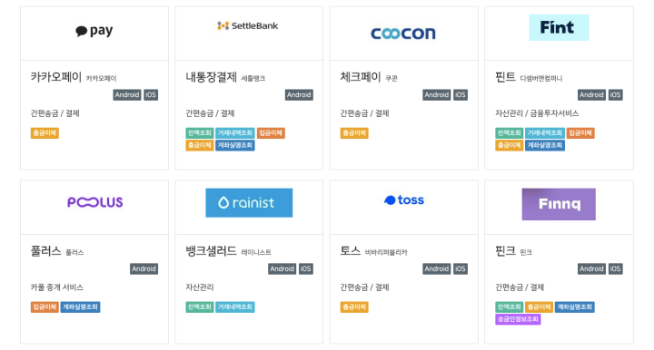 오픈뱅킹은 앱 하나로 모든 금융회사의 서비스를 이용할 수 있도록 한 서비스로 개방형 금융결제망이라고도 하며 현재 KB국민은행, 신한은행, 우리은행, NH농협은행, KEB하나은행 등 17개 시중은행과 토스, 뱅크샐러드 등 7개 핀테크 업체, 24개 오픈 플랫폼 기관 등이 서비스에 참여하고 있습니다.