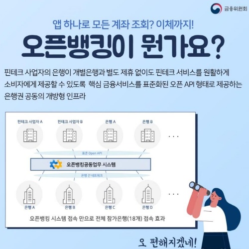 금융위원회는 오픈뱅킹의 확장성 및 안정성 확보를 위해 연구용역 및 업계 설문조사 등을 통한 현장 의견과 해외사례를 충분히 반영하여 오픈뱅킹 고도화를 추진할 예정이며 용역 수행기관 선정을 거쳐 2월부터 본격 착수할 예정이라고 밝혔습니다.