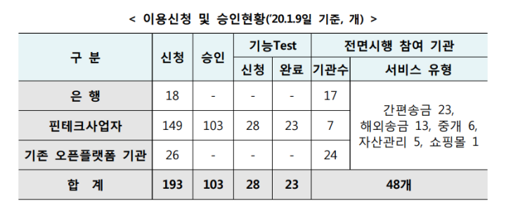 오픈뱅킹 서비스 전면 시행 이후 오픈뱅킹 서비스 총 이용 건수는 8,228만 건으로 일평균 374만 건 수준이며 시범실시 기간 일평균 이용건수 173만 건 대비 116% 증가한 수치입니다. 업권별로는 은행권의 오픈뱅킹 이용규모는 전면시행 이후 시범운영 기간 대비 2배 수준으로 확대되었으며 핀테크 업체의 오픈뱅킹 이용규모는 은행권의 시범운영 기간 초기와 비슷한 수준입니다.