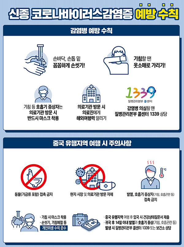 이에 질병관리본부는 우한폐렴, 신종 코로나 바이러스 감염증 예방수칙으로 손씻기와 기침 등 호흡기 증상이 있을 경우 마스크 착용 등 감염병 예방 행동수칙 준수는 물론 후베이성 우한시 등 중국을 여행하는 여행객들은 동물(가금류 포함) 접촉을 피하고, 불가피한 경우 외에는 의료기관 방문을 자제할 것 등을 권고했습니다.