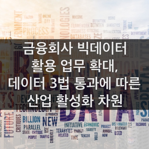 금융위원회는 최근 신용정보법 등 데이터 3법이 국회 본회의를 통과함에 따라 적극행정을 통해 은행, 보험, 금융투자회사 등의 데이터 분석‧ 컨설팅‧유통 등 빅데이터 업무 활성화를 유도하기 위해 빅데이터 부수업무 신고시 신속히 검토하여 수리하고, 빅데이터 활용‧유통 가이드라인 마련을 통해 관련 산업 활성화를 유도한다는 계획입니다.