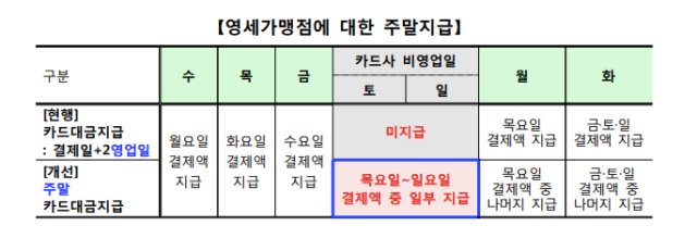 현재 일부 영세가맹점이 카드결제 대금이 지급되지 않는 주말이나 공휴일에 대부업체의 고금리 대출을 이용하는 등 금융부담이 확대되고 있었으나 앞으로는 카드사가 카드결제 승인액을 기초로 주말중 영세가맹점에 승인액 일부를 저리로 대출해주는 주말대출을 시행하여 영세가맹점의 유동성 애로가 해소될 것으로 보입니다.