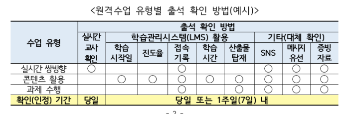 콘텐츠를 활용한 수업의 경우에는 학습관리시스템(LMS)을 활용해 학습시작일, 진도율, 학습시간 등을 기준으로 출석을 체크하게 되며 과제 중심 수업은 LMS를 활용한 접속기록과 과제 수행 결과물 제출 여부를 기준으로 출석을 확인하게 됩니다.