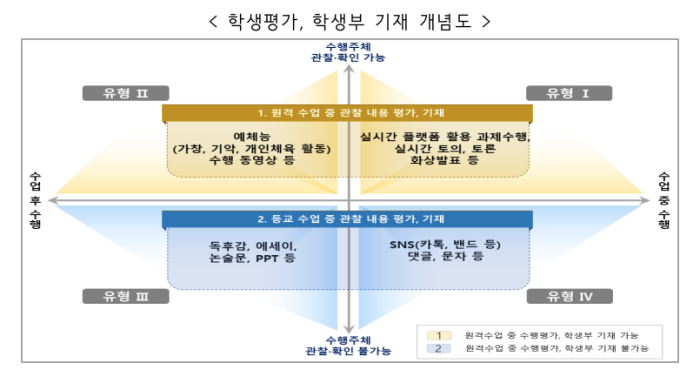 반면, 에세이나 독후감, 발표자료(PPT)나 영상물(UCC)처럼 학생이 직접 수행했는지 부모가 개입했는지 확인이 어려운 경우 등 원격수업 시 학생이 제출한 과제의 과정을 교사가 직접 관찰할 수 없는 경우에는 수행평가 및 학생부에는 반영되지 않습니다.