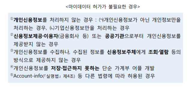 마이데이터는 개인신용정보를 처리하지 않거나 신용정보제공 및 이용자 또는 공공기관으로부터 개인신용정보를 제공받지 않는 경우는 허가를 받지 않아도 됩니다. 또, 개인신용정보를 수집하나 수집된 정보를 신용정보주체에게 조회 및 열람 등의 방식으로 제공하지 않는 경우나 개인신용정보를 저장하거나 접근하지 못하는 단순 애플리케이션을 개발하는 경우에도 허가가 불필요합니다.