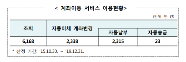 '계좌이동서비스'는 2015년 10월 서비스 개시 이후 약 6168만 건의 조회가 이루어졌고, 2019년 12월 기준 자동이체 계좌변경은 약 2338만 건 수준으로 소비자들이 높은 만족도를 보이는 등 대표적인 국민체감형 금융서비스로 자리 잡았습니다.