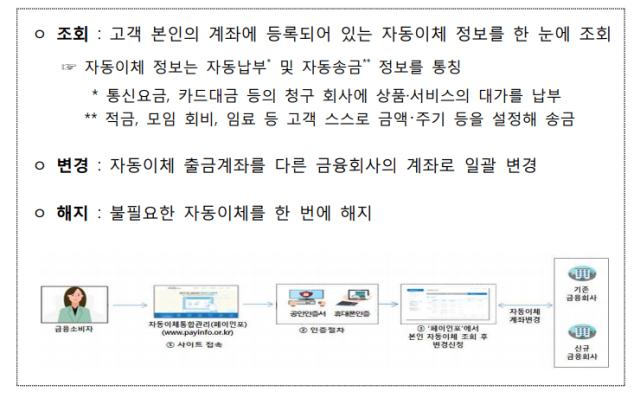 또한, 카드 자동납부를 해지 또는 다른 카드로 변경할 수 있는 '카드이동서비스'를 도입하여 계좌 및 카드를 아우르는 자동이체 원스톱 관리를 할 수 있도록 추진할 계획이라고 밝혔습니다.
