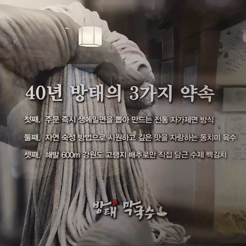방태 막국수는 주문 즉시 생메밀면을 뽑아 만드는 전통 자가제면 방식으로, 자연 숙성 방법으로 시원하고 깊은 맛을 자랑하는 동치미 육수와 해발 600미터 강원도 고랭지 배추로만 직접 담근 수제 백김치가 일품인 막국수 집입니다.