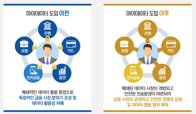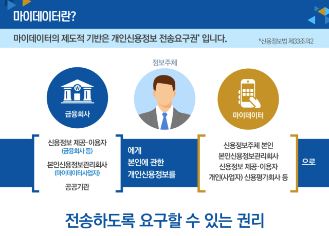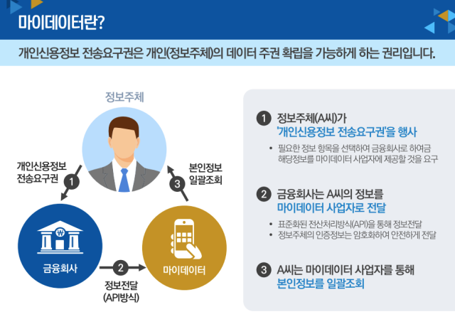 마이데이터 시행에 따라 정보주체는 금융회사나 공공기관, 통신사 등에 분산되어 있는 본인에 관한 개인신용정보를 신용정보주체 본인이나 마이데이터 사업자 등에게 전송하도록 요구할 수 있는 권리를 갖게됩니다. 개인은 마이데이터 사업자를 통해 본인정보를 일괄조회할 수 있게됩니다.