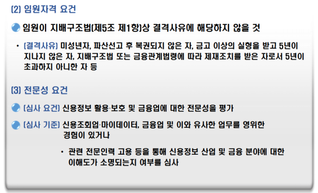 마이 데이터 사업자의 임원은 지배구조법 제5조 제1항 상 결격사유에 해당하지 않아야 하며 신용조회업, 마이데이터, 금융업 및 이와 유사한 업무를 영위한 경험이 있거나 관련 전문인력 고용 등을 통해 신용정보 산업 및 금융분야에 대한 이해도가 소명되는지 여부를 심사하여 신용정보 활용, 보호 및 금융업에 대한 전문성 요건을 충족하는지를 평가하게 됩니다.