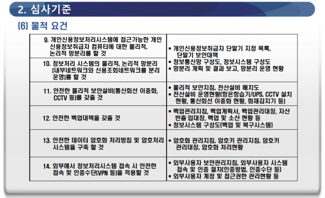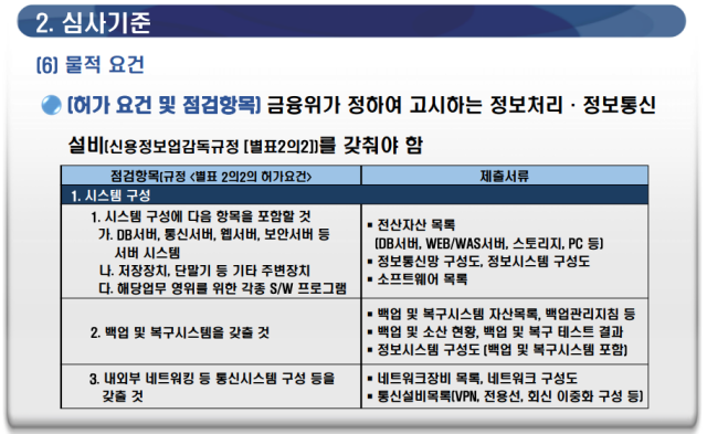 마이데이터 사업자가 물적 요건을 충족하기 위해서는 금융위가 정하여 고시하는 정보처리 및 정보통신 설비를 갖춰야 하며 정보처리 시스템은 논리적, 물리적 망분리를 반드시 해야 합니다.
