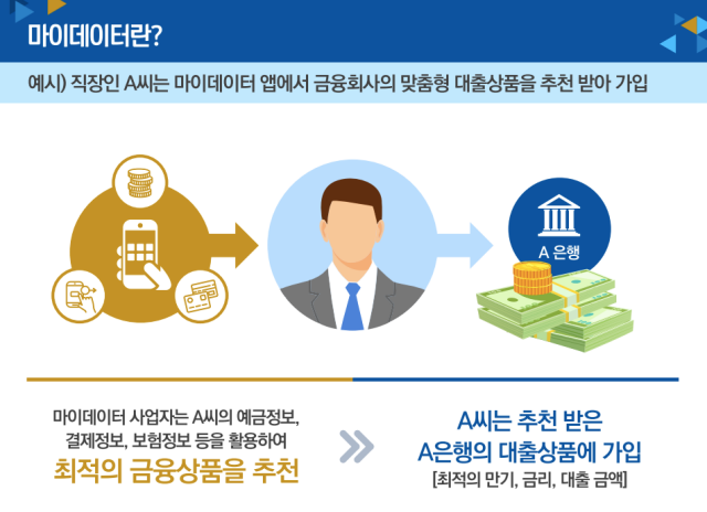 마이데이터 사업이 활성화되면 마이데이터 사업자는 개인의 예금정보, 결제정보, 보험정보 등을 활용하여 최적의 금융상품을 추천할 수 있는 서비스를 제공할 수 있으며 개인은 추천받은 금융회사의 금융상품에 손쉽게 가입할 수 있는 환경이 조성되게 됩니다.