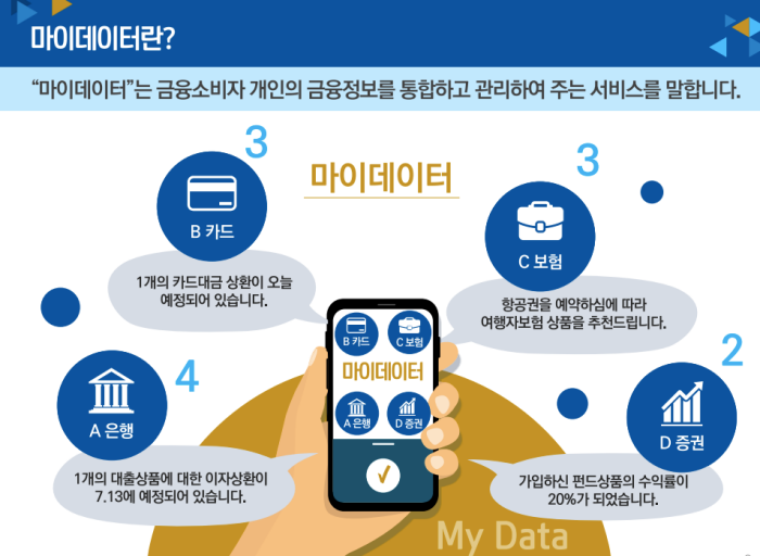 마이데이터는 정보주체의 권리 행사에 기반하여 금융회사 등으로부터 수집한 개인신용정보를 정보주체 본인에게 제공하는 업무로 정의하고 있으며 금융소비자 개인의 금융정보를 통합하고, 체계적으로 관리해 주는 서비스를 말합니다.