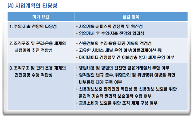 마이 데이터 사업자가 되기 위해서는 금융당국의 허가를 득해야 하며 자본금 요건, 물적 요건, 사업계획 타당성, 대주주 적경성, 임원자격 요건, 전문성 요건을 포함한 6가지 요건을 충족해야 합니다.