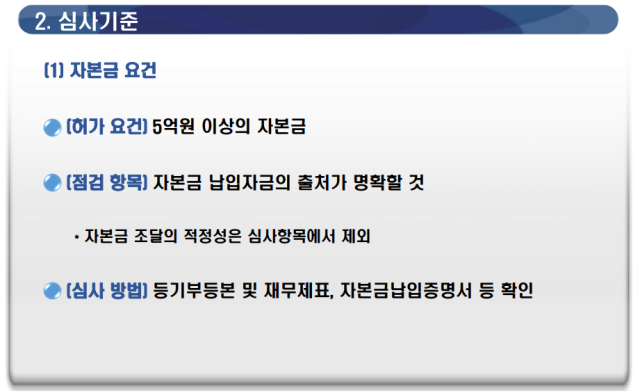 먼저, 자본금 요건은 5억 원 이상의 자본금이 필요하며 자본금 납입자금의 출처가 명확해야 합니다. 자본금 조달의 적정성은 심사항목에서 제외되며 등기부등본 및 재무제표, 자본금 납입증명서 등을 확인하는 방법으로 심사하게 됩니다.