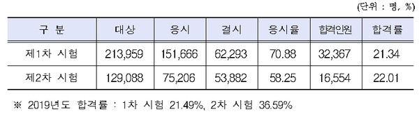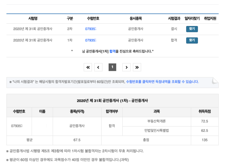 공인중개사 자격시험의 합격 기준은 1차, 2차 시험이 동일하게 매과목 100점 만점에 40점 이상, 전과목 평균 60점 이상을 득점해야 하는데 이번 31회 공인중개사 자격시험의 합격률이 1차 21.34%, 2차 시험 22.01%로 만만치 않은 시험이라는 것을 알 수 있습니다.