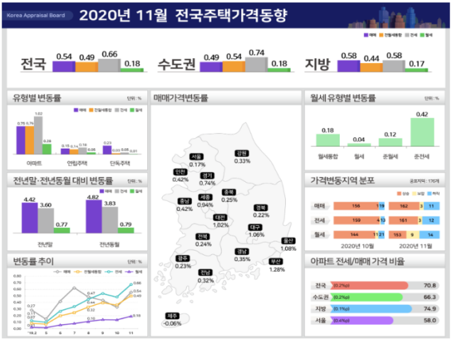 지난 12월 1일 한국감정원이 발표한 11월 전국 주택가격 동향조사 결과 전국 월간 주택종합 매매 가격은 0.54%가 상승한 것으로 나타났습니다.