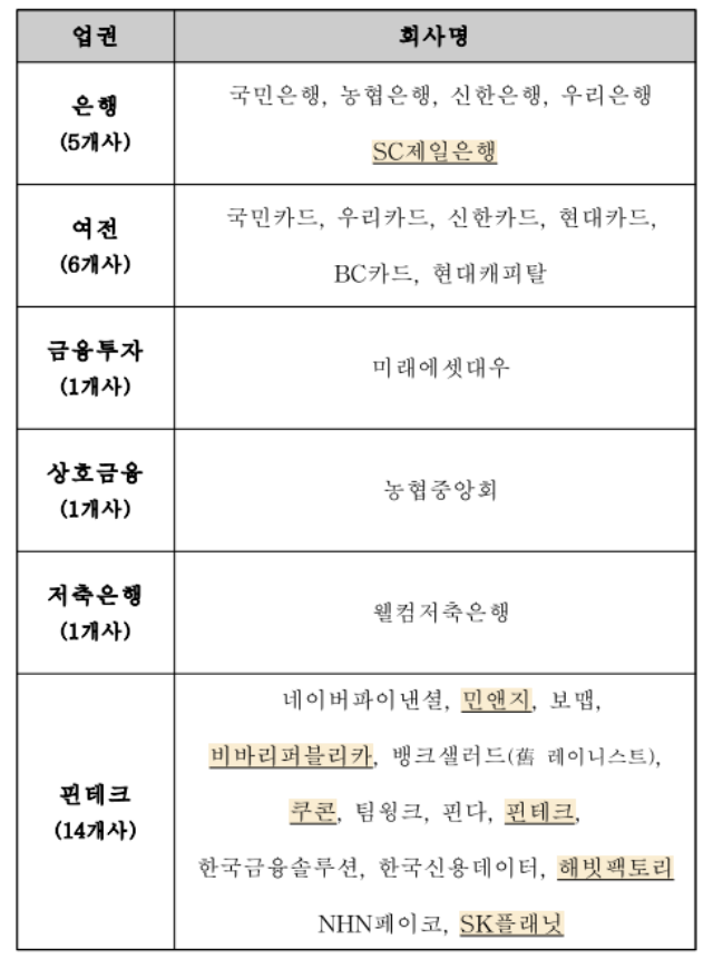 현재까지 마이데이터(본인 신용정보 관리업) 예비허가를 신청한 37개사(35+2) 중 지난번 예비허가를 받은 21개사 외에 토스를 운영하는 비바리퍼블리카, 민앤지, 쿠콘, 핀테크, 해빗팩토리, SC제일은행, SK플래닛이 추가로 예비허가를 받았습니다.