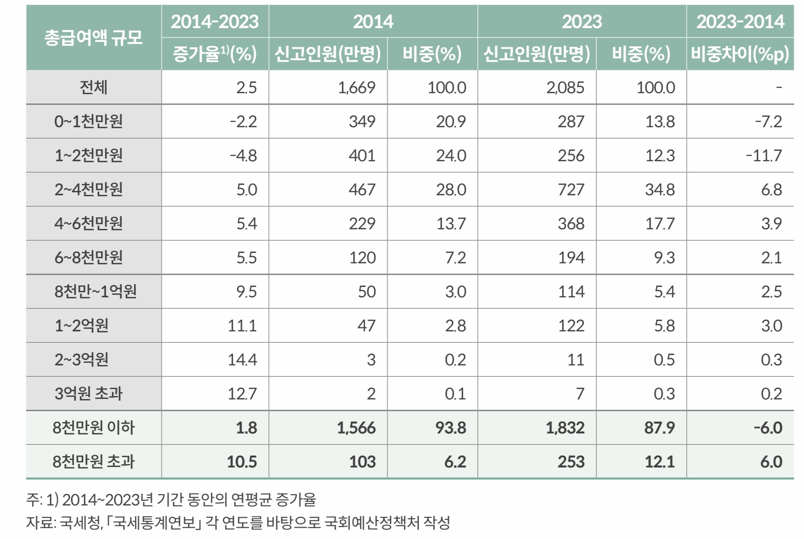 2014년 103만 명이었던 8000만 원 초과 소득자는 2023년 253만 명으로 약 두 배 증가했습니다.