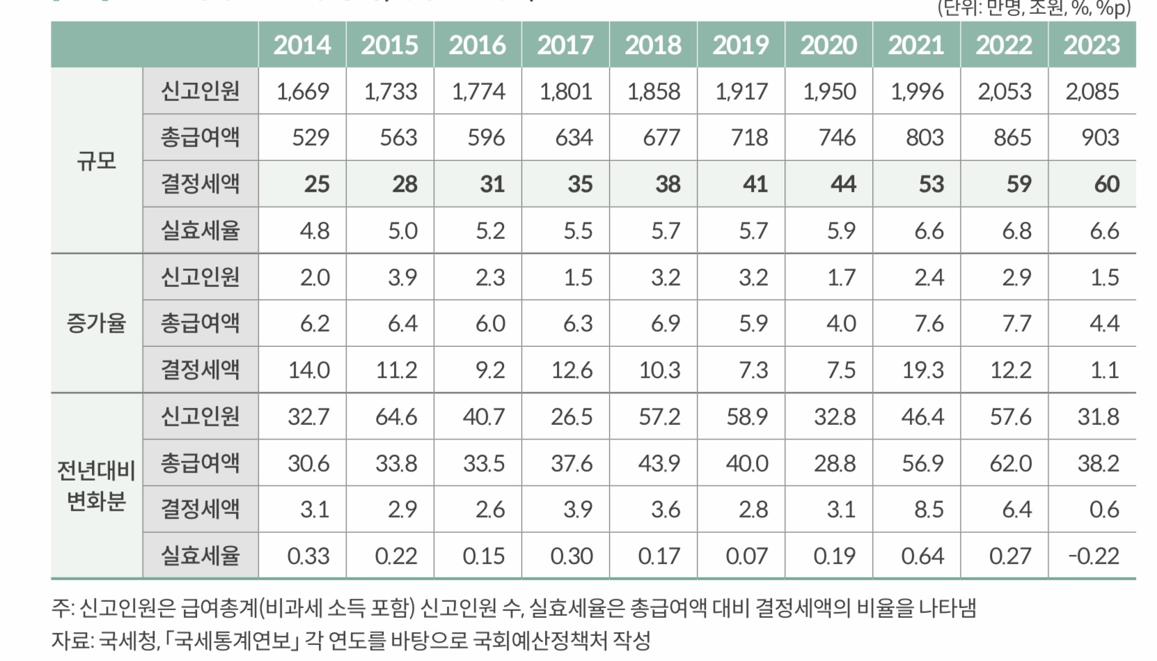 2023년 근로소득 세수는 60조 원으로, 2014년 25조 원에 비해 2.4배 증가했습니다. 이는 같은 기간 근로소득 신고자 수가 연평균 2.5% 증가한 데 그친 것과 비교했을 때 매우 높은 증가율입니다.